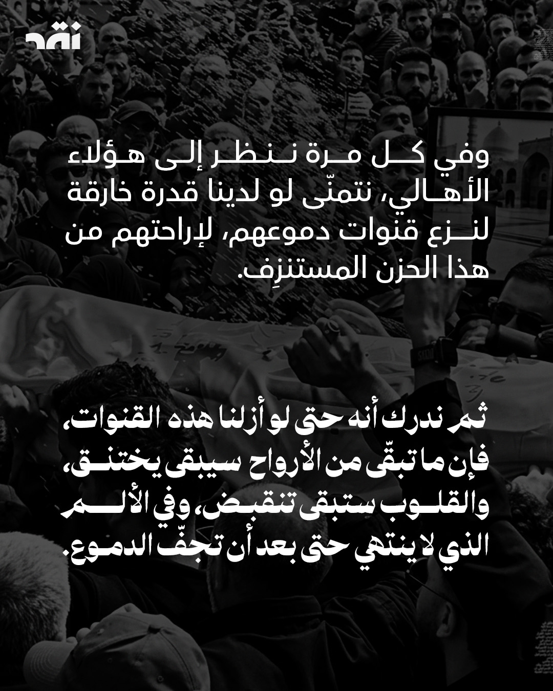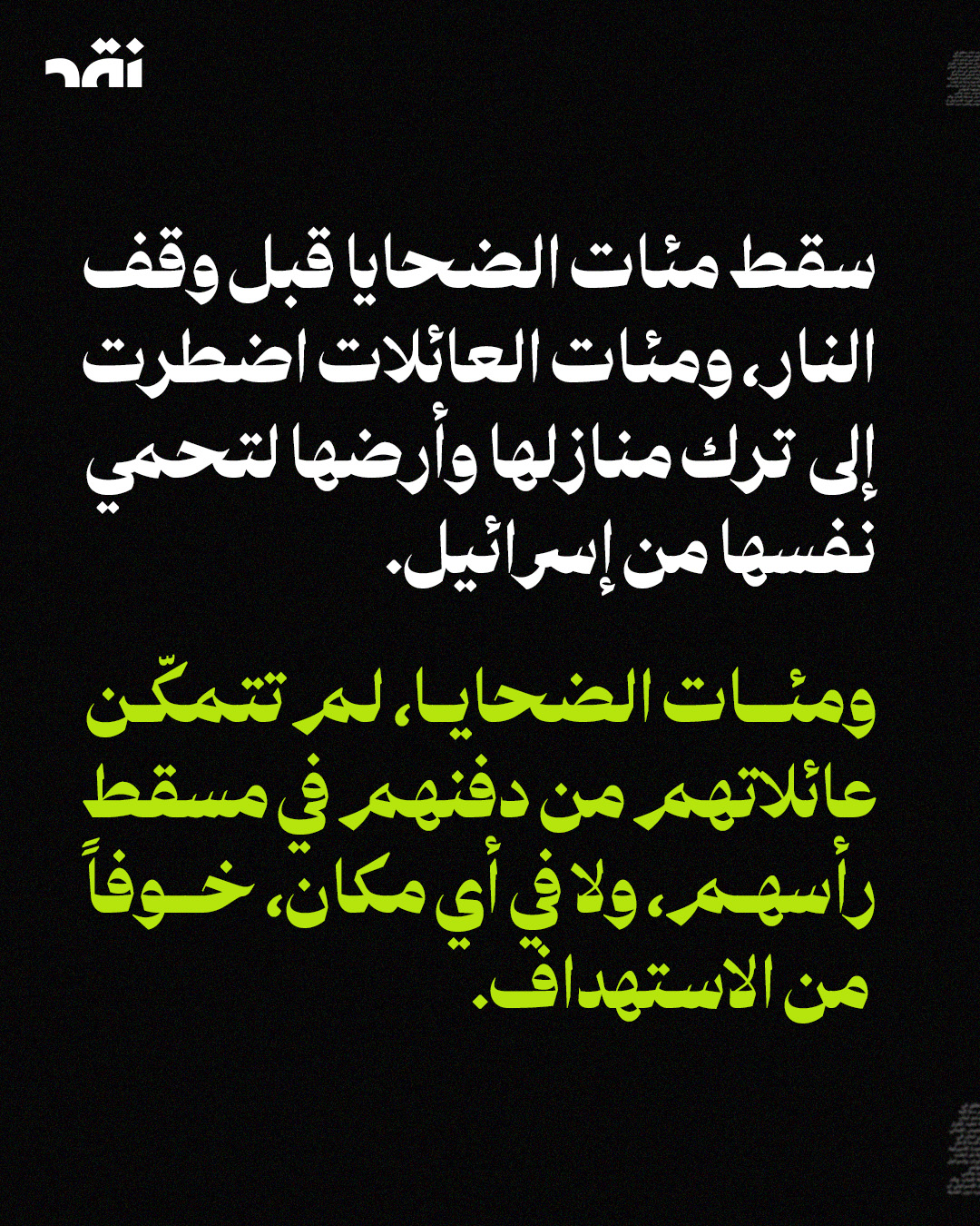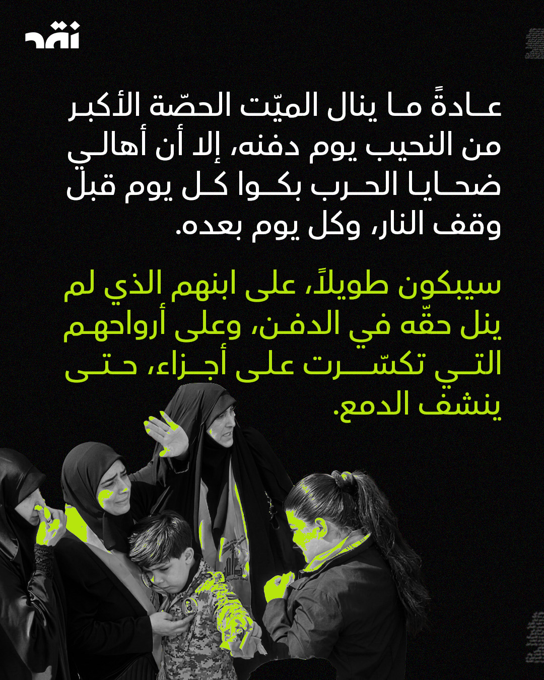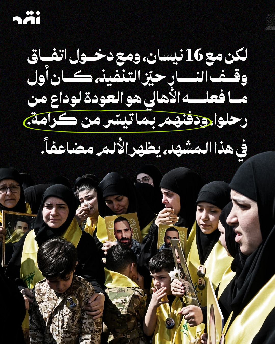 قبل #وقف_إطلاق_النار، حُرم مئات الأهالي حتى من وداع أحبّائهم ودفنهم.ومع دخوله حيّز التنفيذ، عادوا ليشيّعوهم بما تيسّر من كرامة.لكن الحزن لم ينتهِ… بل بدأ يتكرّر كل يوم.