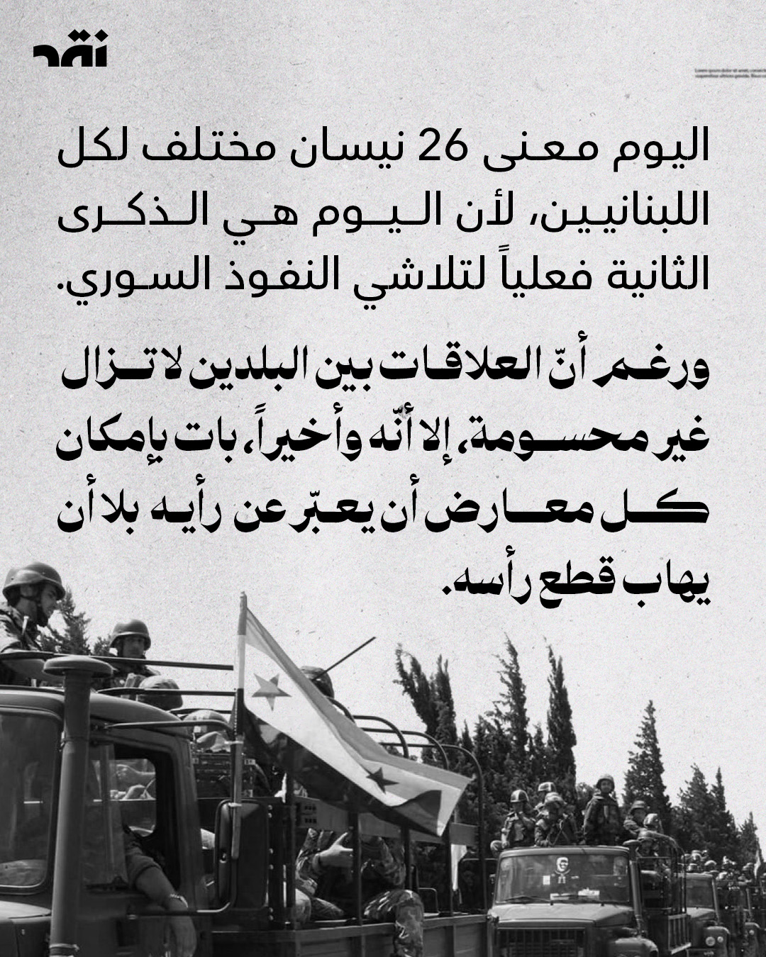 في 26 نيسان 2005، انسحب #الجيش_السوري من لبنان، لكن النفوذ لم ينتهِ فعليًا إلا بعد 2024. بين التاريخين، تداخلت الوصاية السورية مع نفوذ إيراني قيّد الدولة واستنزفها. اليوم، يتبدّل معنى الذكرى مع تراجع هذا النفوذ واتّساع هامش التعبير.