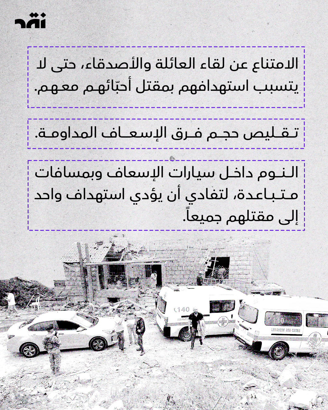 فمنذ 2 آذار، استهدفت #إسرائيل ما لا يقل عن 128 منشأة طبية وسيارات إسعاف في جنوب لبنان، ما أسفر عن مقتل 40 من العاملين في القطاع الصحي وإصابة 107 آخرين. كما تعتمد إسرائيل ما يُعرف بـ”الضربة المزدوجة”، إذ يُتبع الهجوم الأول بتوقف قصير، ثم تُنفَّذ ضربة ثانية بعد وصول فرق الإسعاف.