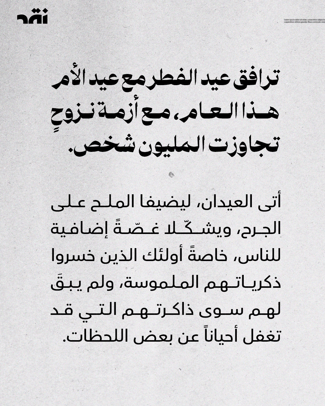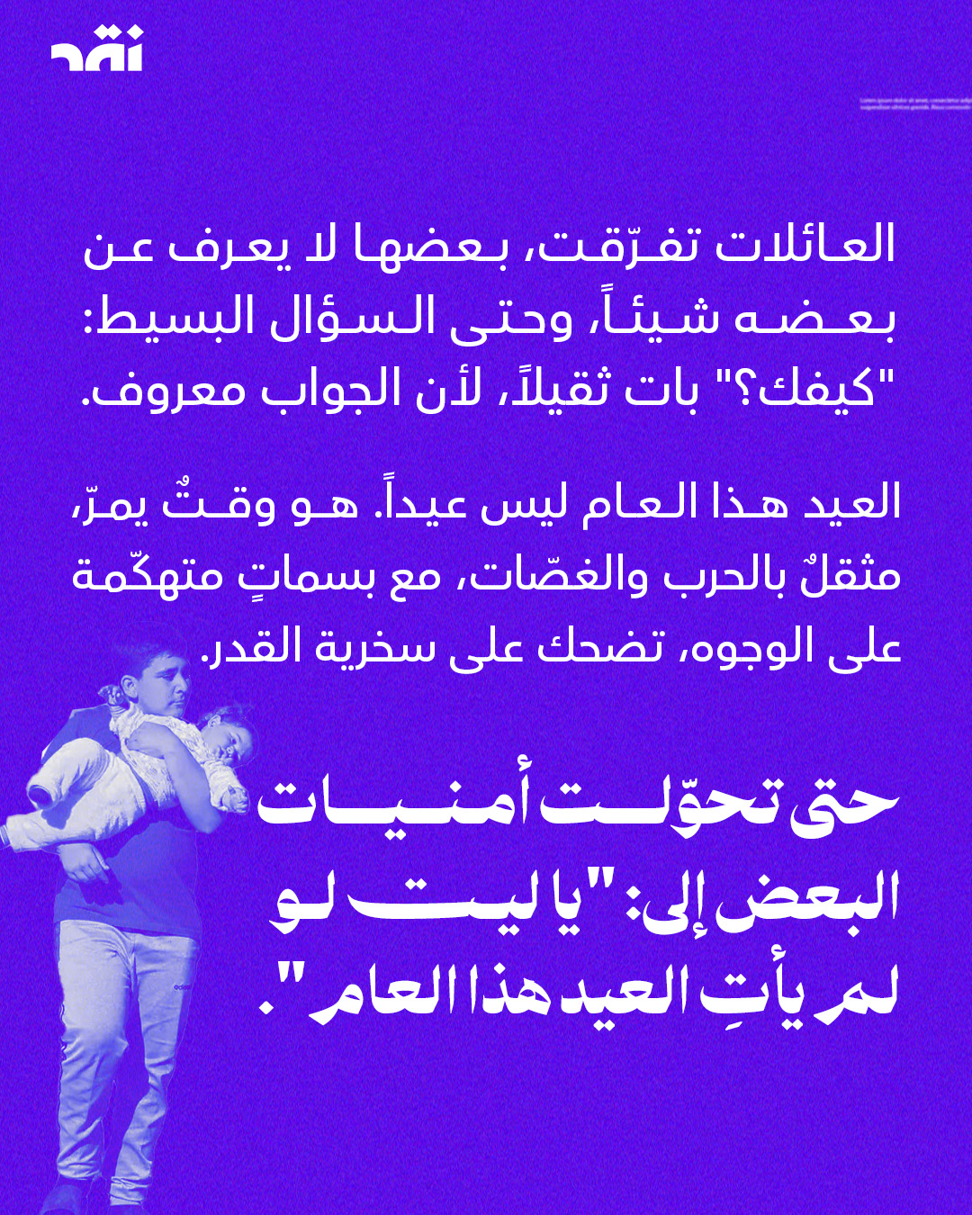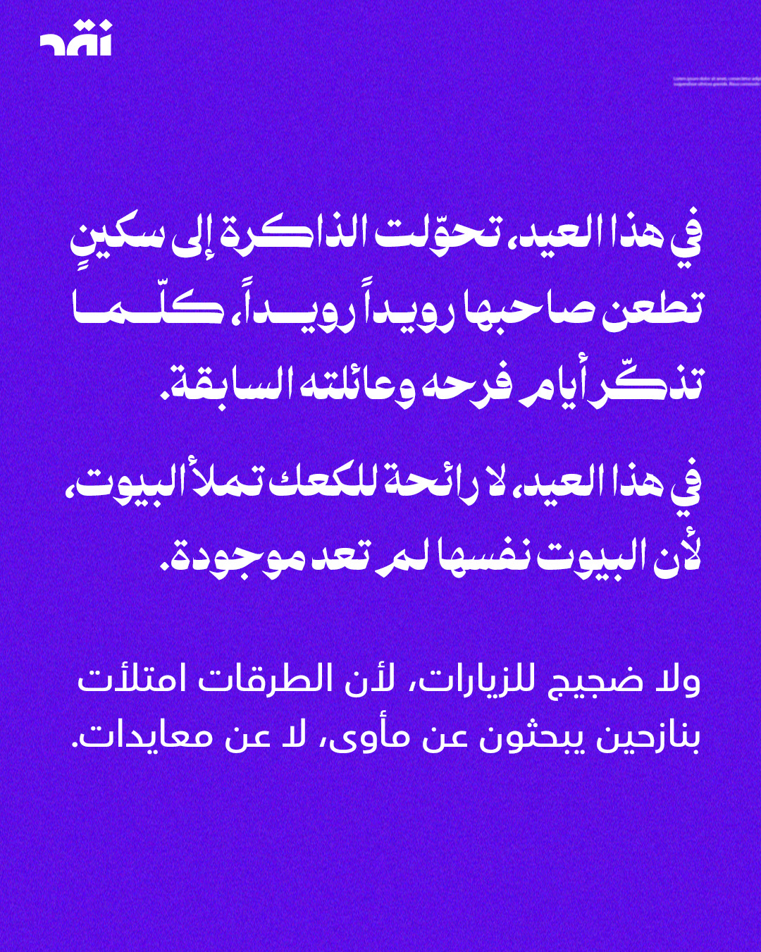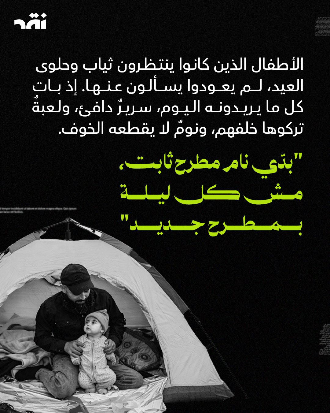 عيدٌ بلا بيت، بلا رائحة كعك، وبلا أصوات زيارات. أكثر من مليون #نازح يمرّ عليهم #العيد كذكرى موجعة، لا كفرحة منتظرة. الأطفال لا يريدون هدايا، بل مكاناً ثابتاً ينامون فيه. والأم لا تنتظر عيدية، بل تبحث عن بطانية تحمي أولادها. في بلدٍ تتكرّر فيه الخسارات، حتى العيد تحوّل إلى عبء.