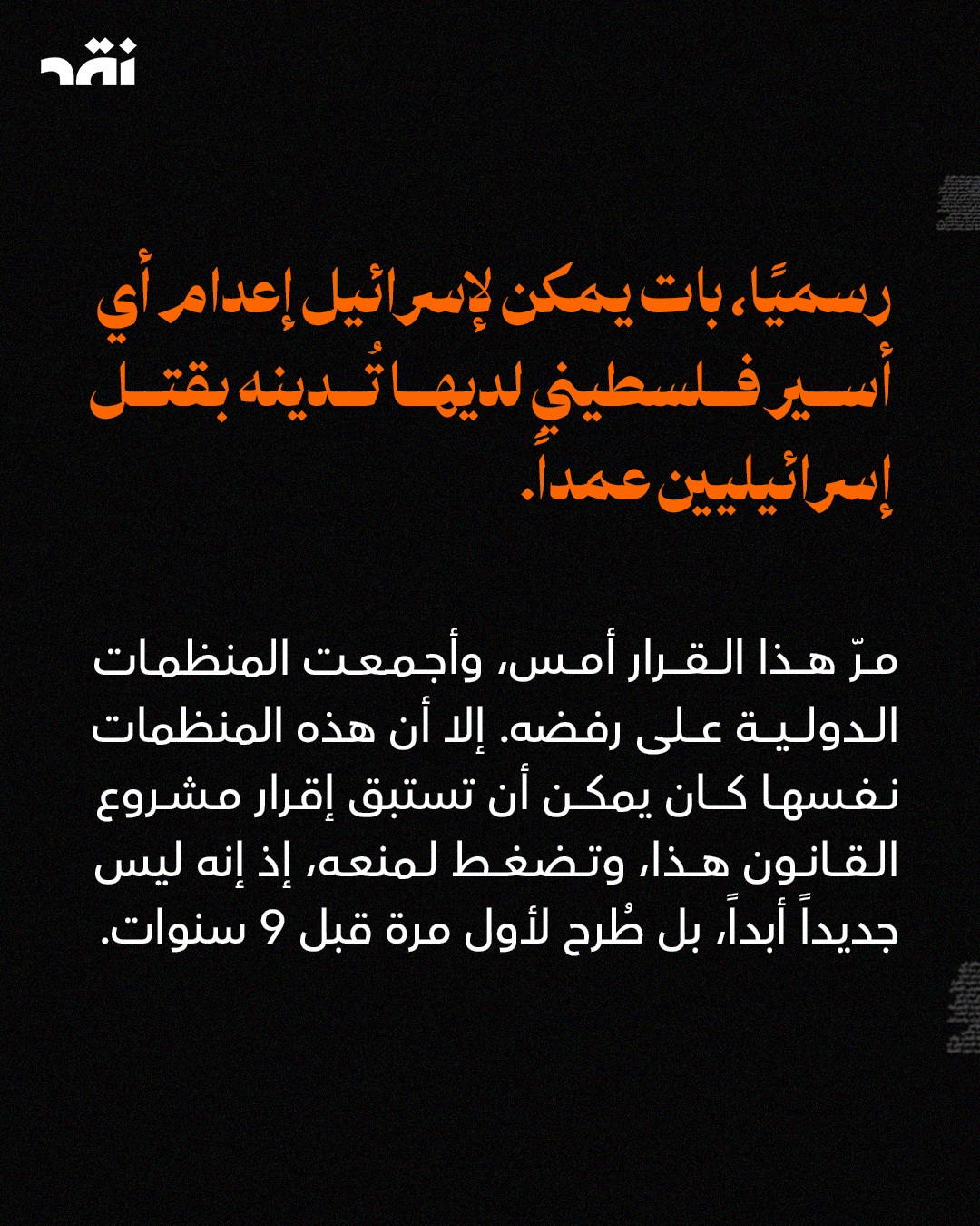 مرّ أمس في #الكنيست_الإسرائيلي تشريع إعدام الأسرى الفلسطينيين، بعد سنوات من طرح مشروع القانون لأول مرة عام 2017، في ظل ضعف واضح في الضغط الدولي لمنع إقراره، وبالتوازي مع تغيّر الأوضاع الأمنية والسياسية وصعود حكومات يمينية أكثر تشددًا إلى الحكم في إسرائيل.
